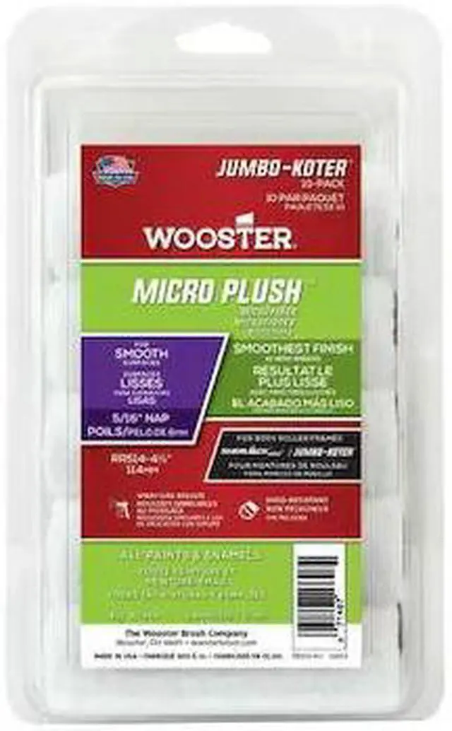 Mini Paint Roller Cover, Cover Type Standard, Surface Texture Smooth, Compatible Roller Frame Style Cage, 4 1/2 in Overall Length, 5/16 in Nap Size, Surface Material Drywall, Metal, Wood, Paint Type All Paints, Enamels, Core Diameter 3/4 in, Cover Material Microfiber, Core Material Polypropylene, For Use With Jumbo-Koter Cage Frames, Package Quantity 10