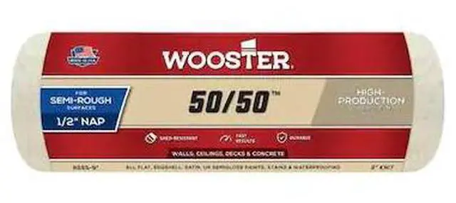 Paint Roller Cover, Cover Type Standard, Surface Texture Semi-Rough, Compatible Roller Frame Style Cage, 9 in Overall Length, 1/2 in Nap Size, Surface Material Concrete, Drywall, Masonry, Wood, Paint Type Flat Paints, Satin Paints, Stains, Waterproofing, Core Diameter 1 1/2 in, Cover Material Polyester, Wool, Core Material Polypropylene, For Use With 9 in W, Any 1 1/2 in dia Cage Frame, Sheen Type Satin, Semi-Gloss. This item has been restricted from sale in the following state (s): []