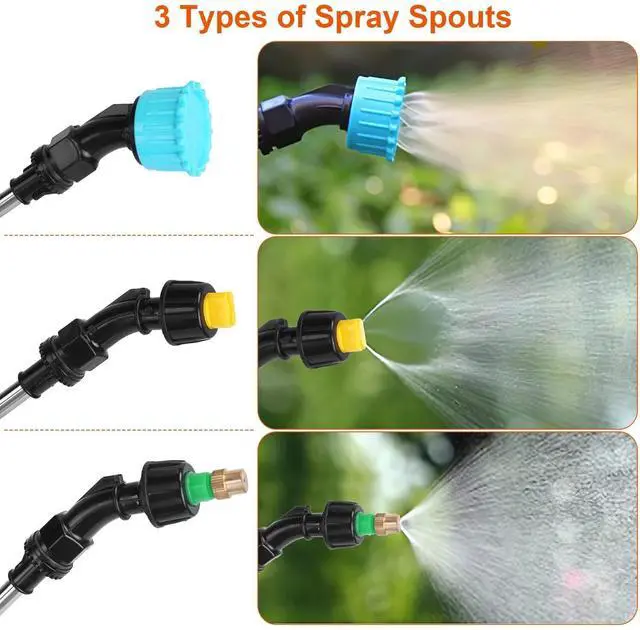 3 Spray Spouts:Provides 3 different spray spouts,including 1pc atomizer,1pc 6-hole spray spout and 1pc sector-shaped spout,which fully meet your different spray needs. Easily access an narrow or less reachable area your plants grew.