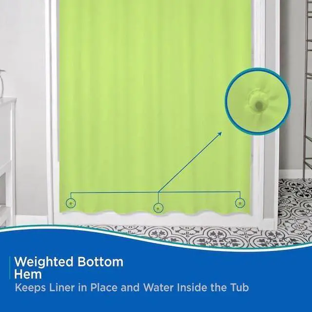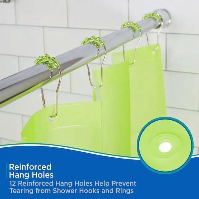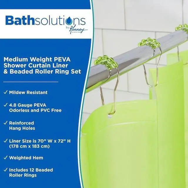 Update the look of your bathroom with a color coordinating Kenney Medium Weight PEVA Shower Curtain Liner and Beaded Roller Ring Set. The set includes 12 metal shower rings with colored beads that match the liner. The roller balls allow the rings to glide effortlessly across your shower rod. Use it as a stand-alone shower curtain, or as a liner with a shower curtain.Made of environmentally friendly PEVA, this medium weight bath liner is PVC-free and odorless. The liner has 12 reinforced hang holes to prevent tearing from shower hooks and rings. It is treated to be resistant to mildew, so it will help keep your shower clean and free of buildup. Standard sized, it measures 70 inches wide by 72 inches tall (180 cm x 183 cm) to fit most showers and bath tubs.