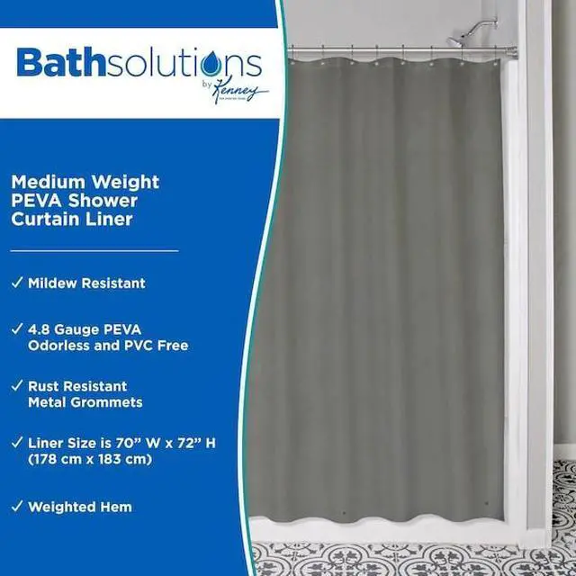The Kenney Medium Weight PEVA Shower Curtain Liner is made of environmentally friendly PEVA, making it PVC-free and odorless. The liner has 12 rust-resistant metal grommet hang holes to prevent tearing from shower hooks and rings. The weighted hem on the waterproof liner keeps the liner in place, so water stays in your bathtub and off of the floor. It is treated to be resistant to mildew, so it will help keep your shower clean and free of buildup.Standard sized, it measures 70 inches wide by 72 inches tall (180 cm x 183 cm) to fit most showers and bath tubs.