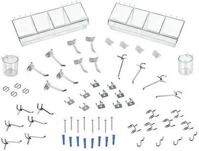 Organize any space with Azar Displays 64-Piece Pegboard Accessory Organizer Kit. Keep your work or craft space neat, clean and items easily accessible. Azar's Accessory Set comes with hooks, screws, bins, and cups to hold and organize any supplies in your home, workplace, garage, shed, basement, craft room, play room, dorm room, storage room, or retail environment. Pegboard not included. Use the peg hardware kit with your own pegboard, all pieces fit a standard 0.25" diameter peg hole that are 1" on center.