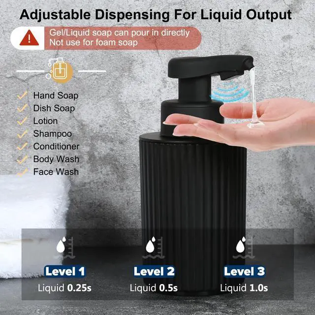 With a generous 260ml capacity, it suits various scenarios. The large bottle mouth design ensures no more spills when refilling. This soap dispenser only have one level,Touch the top switch for 3 seconds to turn on/off, that's it!