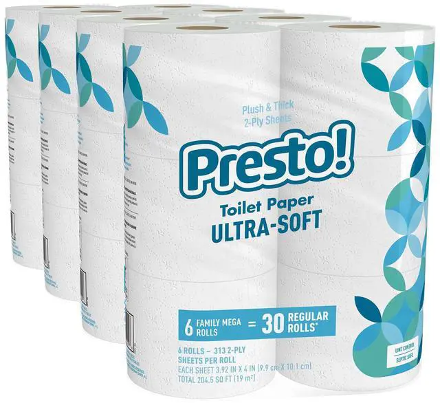 Amazon Brand -2-Ply Ultra-Soft Toilet Paper, Septic-Safe, 24 Family Mega Rolls = 120 Regular Rolls, 308 Sheets, Unscented, Pack of 4