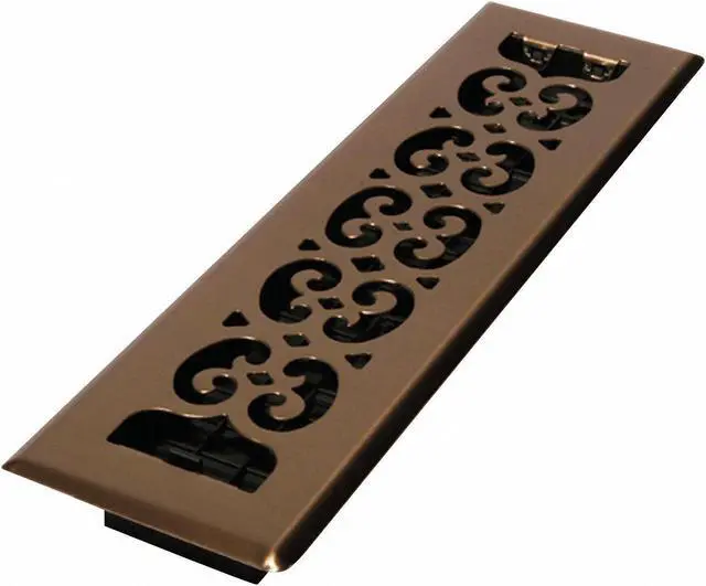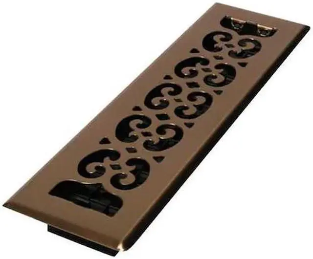 Floor Register, Overall Depth 1 3/8 in, Overall Height 13 1/2 in, Overall Width 3 3/4 in, Maximum Opening Height 12 in, Maximum Opening Width 2 3/8 in, Filter Depth 1 3/8 in, Filter Height 13 1/2 in, Filter Width 3 3/4 in, Grille Color Brass, Grille Material Steel, Material Steel, Damper Material Plastic, Bar Spacing Not Applicable, Face Design Decorative, Airflow Directions One-Way, Adjustable Blades No, Mounting Location Floor, Mounting Style Lay-In, Blade Angle 180 Degrees, Finish Antiqued.