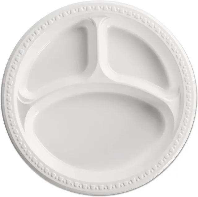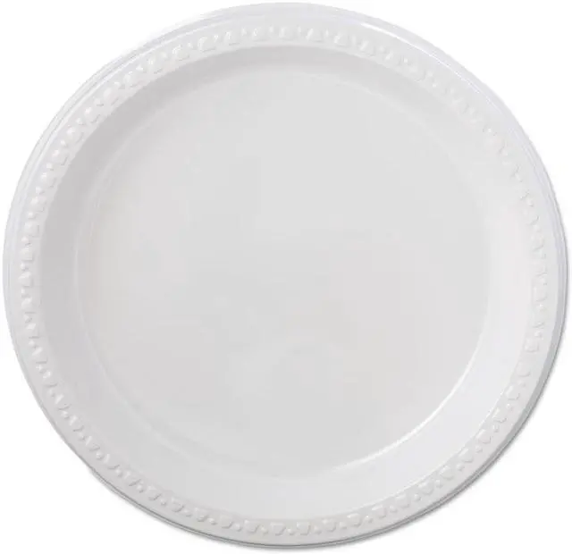 Premium-grade dinnerware provides superior strength and durability. Decorative, raised-rim border features a tasteful, contemporary design. Gloss-finished heavyweight plastic ensures rigid, cut- and leak-proof performance. Nesting, stackable pieces help you conserve storage space. Dinnerware Type: Plate; Material(s): Plastic; Shape: Round; Diameter: 10 1/4".