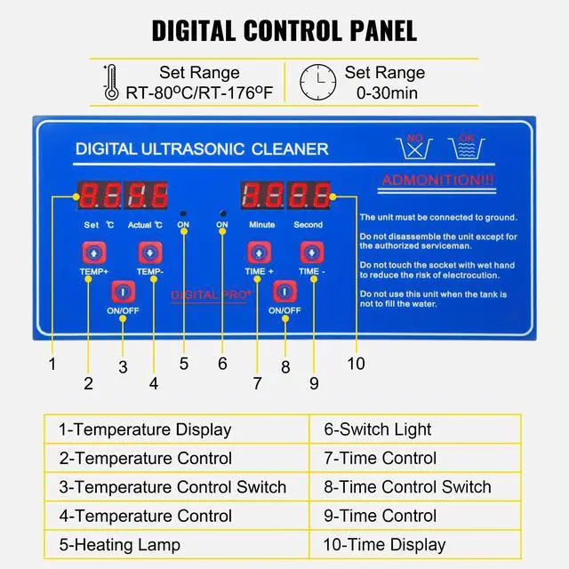 • CONTROL PANEL- Digital display and control panel for precise washing time and temperature control. Button adjustment, a commercial ultrasonic cleaner is simple and easy to operate.