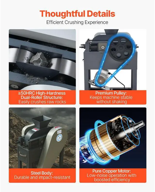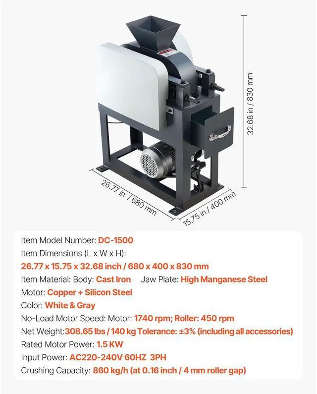 Crushing Capacity: 860 kg/h (at 0.16 inch / 4 mm roller gap)