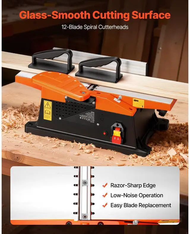 Spiral Benchtop Jointer, 6 in, 2 HP 12000 RPM Bench Top Wood Jointer, with 12-Blade Spiral Cutterhead, Up to 1/8 in Depth, Adjustable Fence, 6 x 23 in Cast Aluminum Table, for Woodworking DIY