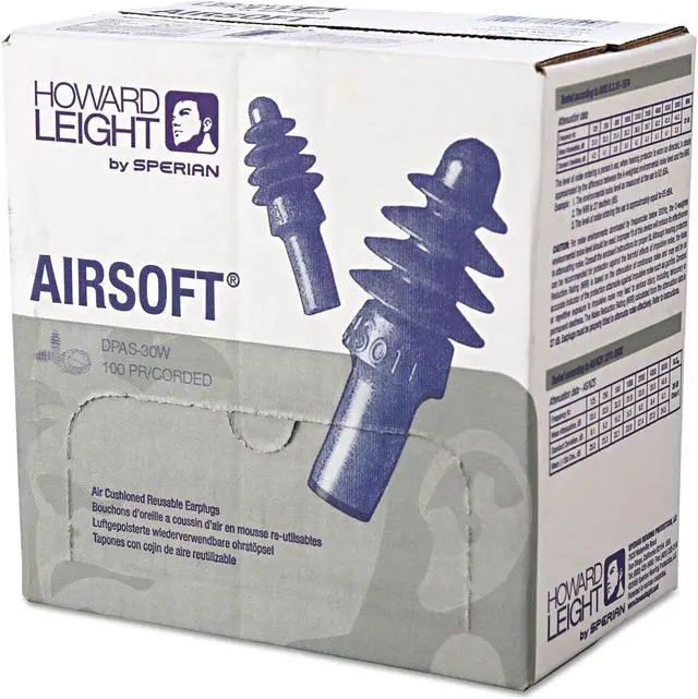 Howard Leight by Honeywell AirSoft Reusable Earplugs Advanced air pocket design features internal noise-blocking fins. Rounded flanges, tapered shape fits better in the ear canal. Firm stem facilitates easy insertion and removal. Four-flange profile creates better seal in the ear canal. Less pressure in the ear canal eliminates that “plugged up” feeling Pack of 100