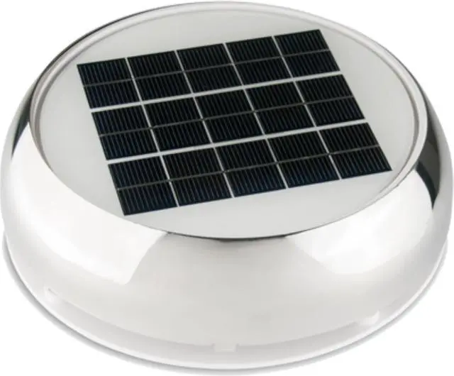 3" Day/Night Solar Vent - Stainless Steel, MFG# N20803S, with on/off fan switch, LED lights and intake/exhaust switch accessible from inside the cabin. 24 hr. rechargeable battery. 9" diameter, 3.75" hole, 800 cu. ft. /hr.