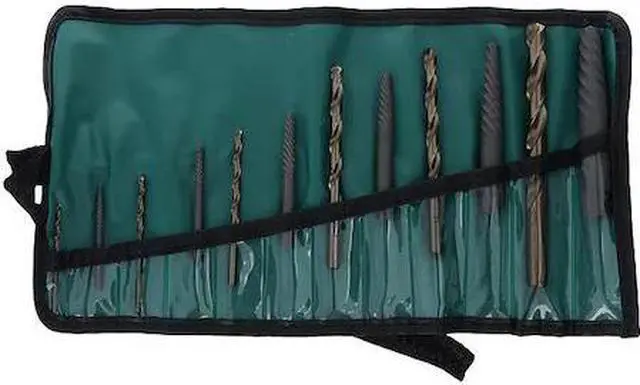 Screw Extractor Set, Extractor Type Spiral Flute Extractor, Number of Pieces 12, Drill Size 1/4 in, 13/32 in, 17/64 in, 5/32 in, 5/64 in, 7/64 in, For Bolt Size #8 to 1 in, Material - Machining Carbon Steel, Overall Length 2 in, 2 3/8 in, 2 3/4 in, 3 in, 3 3/8 in, 3 3/4 in, Container Type Pouch, Drive Type Square. This item has been restricted from sale in the following state (s): []