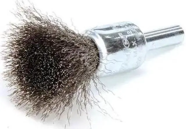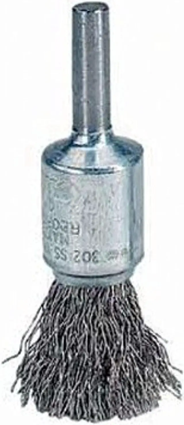 End Brush, Product Type End Brush, Quick Change System Not Applicable, Bristle Type Crimped Wire, Bristle Material Stainless Steel, Brush Dia. 1/2 in, Wire Dia. 0.006 in, Bristle Length 7/8 in, Grit Not Applicable, Overall Length 2 1/2 in, Compatible Tool Type Straight Grinder, Drill, Impact Driver, Pencil Grinder, Color Silver, Primary Material Application Carbon Steel, Stainless Steel, Connector Type Round Shank, Connector Size 1/4 in, Operating Speed - Maximum 25, 000 RPM, Shank Length 5/8 in.