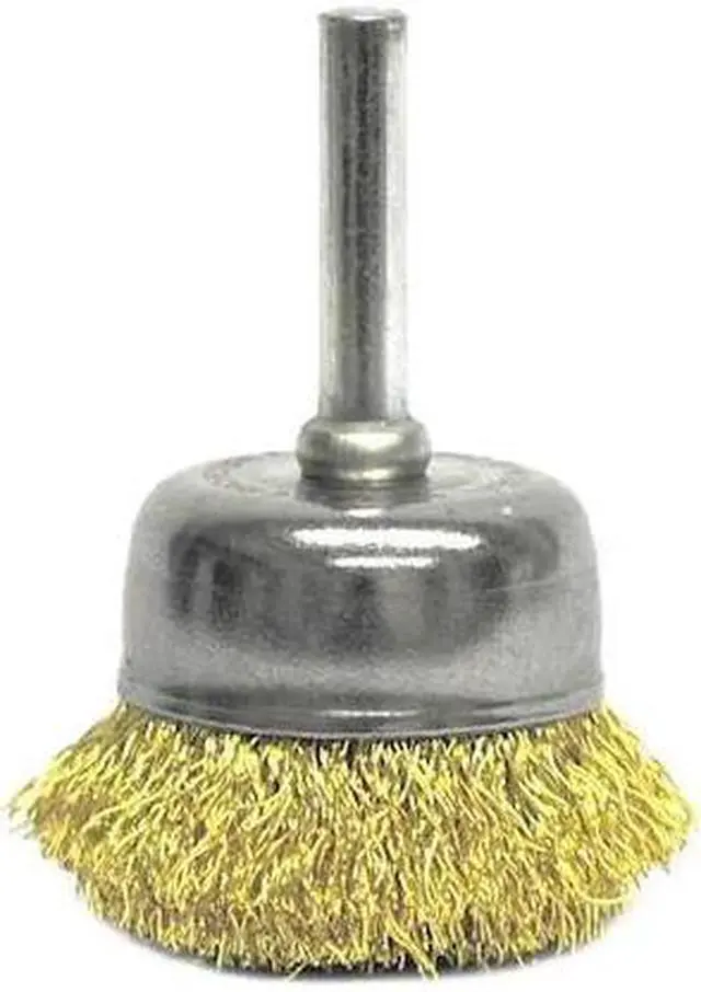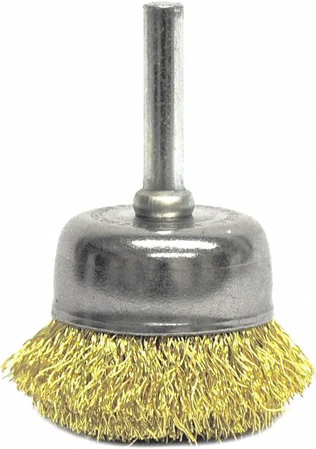 Cup Brush, Product Type Cup Brush, Quick Change System Not Applicable, Bristle Type Crimped Wire, Bristle Material Brass, Brush Dia. 1 3/4 in, Wire Dia. 0.006 in, Bristle Length 3/4 in, Grit Not Applicable, Overall Length 1 1/2 in, Compatible Tool Type Straight Grinder, Drill, Impact Driver, Pencil Grinder, Color Silver, Primary Material Application Brass, Connector Type Round Shank, Connector Size 1/4 in, Operating Speed - Maximum 13, 000 RPM, Shank Length 1 9/16 in. This item has been restricted from sale in the following state (s): []