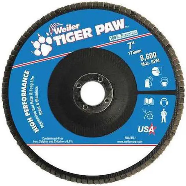 Flap Disc, Abrasive Type Coated, Abrasive Material Zirconia Alumina, Grade Medium, Backing Plate Material Phenolic, Connector Size 7/8 in, Connector Type Unthreaded Hole, Density Rating Standard, Flap Disc Type Type 29, Overall Diameter 7 in, Series Tiger Paw, Backing Material Phenolic, Backing Weight X, Grit 60, Maximum Operating Speed 8, 600 RPM, Color Blue