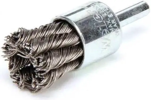 End Brush, Product Type End Brush, Quick Change System Not Applicable, Bristle Type Standard Twist Knot Wire, Bristle Material Carbon Steel, Brush Dia. 3/4 in, Wire Dia. 0.02 in, Bristle Length 7/8 in, Grit Not Applicable, Overall Length 2 1/4 in, Compatible Tool Type Die Grinder, Drill, Impact Driver, Pencil Grinder, Straight Grinder, Color Silver, Primary Material Application Carbon Steel, Cast Iron, Connector Type Round Shank, Connector Size 1/4 in, Operating Speed - Maximum 22, 000 RPM.