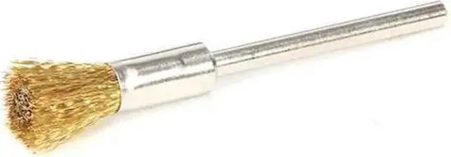 Miniature End Brush, Product Type End Brush, Quick Change System Not Applicable, Bristle Type Crimped Wire, Bristle Material Brass, Brush Dia. 1/4 in, Wire Dia. 0.005 in, Bristle Length 7/16 in, Grit Not Applicable, Overall Length 2 1/4 in, Compatible Tool Type Die Grinder, Drill, Impact Driver, Pencil Grinder, Straight Grinder, Color Silver, Primary Material Application Brass, Connector Type Round Shank, Connector Size 1/8 in, Operating Speed - Maximum 37, 000 RPM