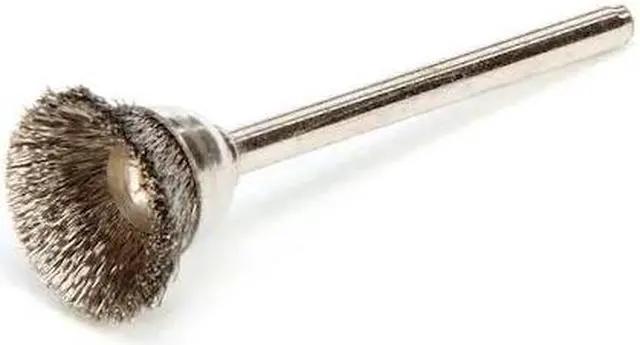 Miniature Cup Brush, Product Type Cup Brush, Quick Change System Not Applicable, Bristle Type Crimped Wire, Bristle Material Stainless Steel, Brush Dia. 5/8 in, Wire Dia. 0.005 in, Bristle Length 1/4 in, Grit Not Applicable, Overall Length 1 7/8 in, Compatible Tool Type Die Grinder, Drill, Impact Driver, Pencil Grinder, Straight Grinder, Color Silver, Primary Material Application Stainless Steel, Connector Type Round Shank, Connector Size 1/8 in, Operating Speed - Maximum 37, 000 RPM