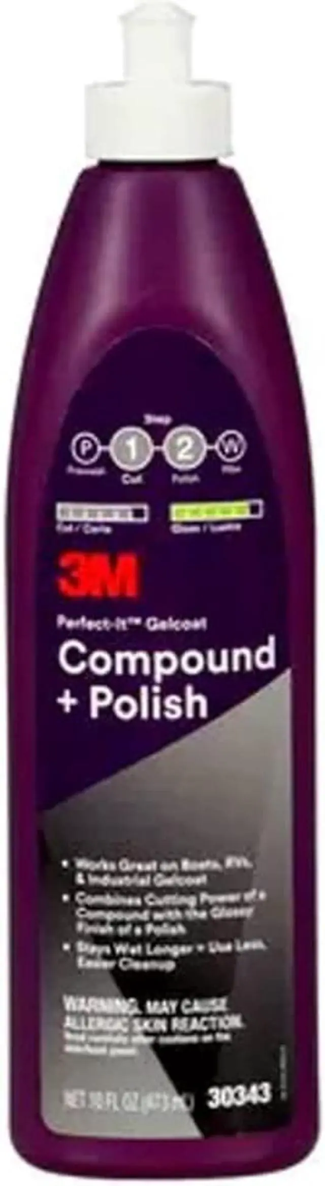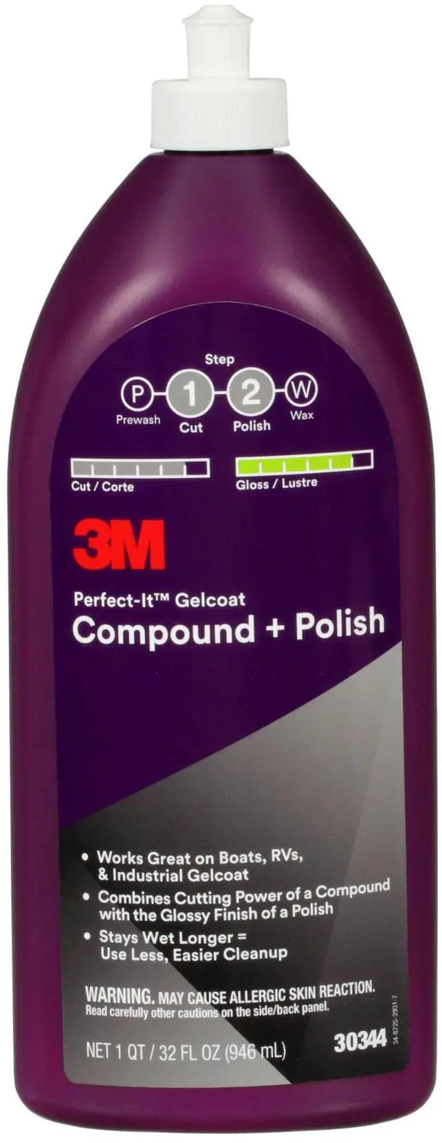 Our 3M Perfect-It Gelcoat Compound + Polish is a professional-grade formula, designed to be used as a single-step compound and polish or second step finish for eliminating P1000 and finer scratches, scuff marks, and other surface blemishes from gelcoat surfaces (even darker colored gelcoat) including marine, RV, and industrial.