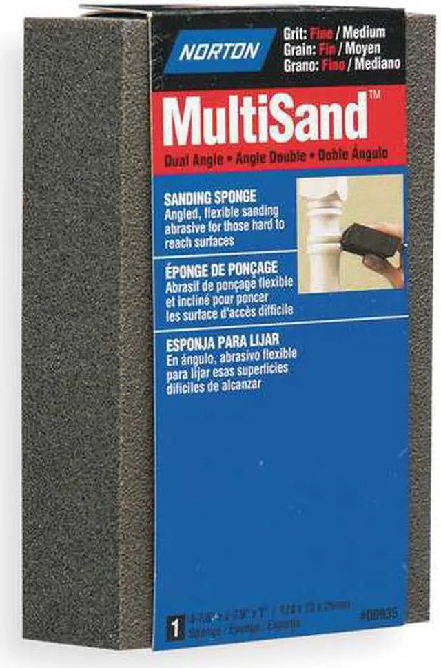 Dual-Angle Sanding Sponge, Abrasive Material Aluminum Oxide, Grade Medium/Coarse, Grit Not Applicable, Number of Abrasive Sides 4, Series MultiSand, Overall Length 4 7/8 in, Overall Thickness 1 in, Overall Width 2 7/8 in, Abrasive Type Coated, Color Black, Features Reusable, Resistance Properties Tear, Sponge Shape Angled