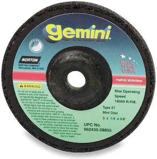 Depressed Center Grinding Wheel, Abrasive Material Aluminum Oxide, Connector Size 7/8 in, Connector Type Unthreaded Hole, Grit 24, Overall Diameter 4 1/2 in, Overall Thickness 0.25 in, Primary Material Application Cast Iron, Stainless Steel, Steel, Compatible Tool Type Angle Grinder, Series Gemini, Wheel Type Type 27, Maximum Operating Speed 13, 580 RPM, Grade Extra Coarse. This item has been restricted from sale in the following state (s): []