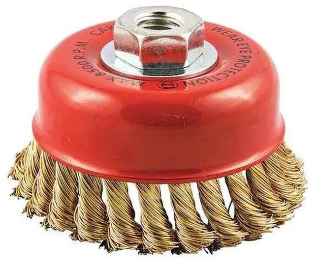 Cup Brush, Product Type Cup Brush, Quick Change System Not Applicable, Bristle Type Standard Twist Knot Wire, Bristle Material Brass, Brush Dia. 4 in, Wire Dia. 0.02 in, Bristle Length 7/8 in, Grit Not Applicable, Overall Length Not Applicable, Compatible Tool Type Right-Angle Grinder, Color Not Applicable, Connector Type Threaded Hole, Connector Size 5/8 In. -11, Operating Speed - Maximum 8, 500 RPM, Shank Length Not Applicable. This item has been restricted from sale in the following state (s): []