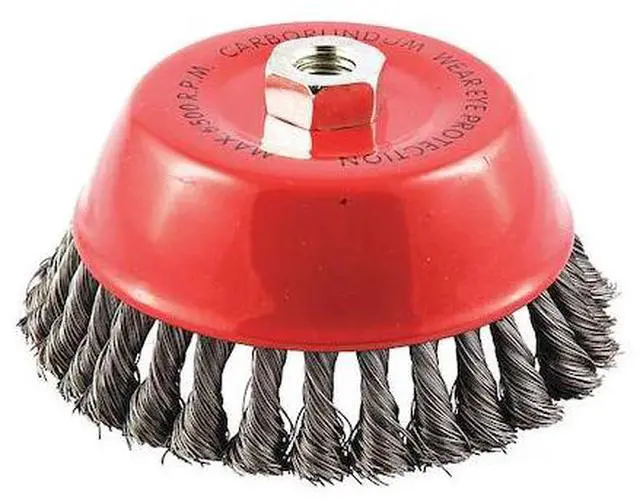Cup Brush, Product Type Cup Brush, Quick Change System Not Applicable, Bristle Type Standard Twist Knot Wire, Bristle Material Carbon Steel, Brush Dia. 6 in, Wire Dia. 0.014 in, Bristle Length 1 1/4 in, Grit Not Applicable, Overall Length Not Applicable, Compatible Tool Type Right-Angle Grinder, Color Not Applicable, Connector Type Threaded Hole, Connector Size 5/8 In. -11, Operating Speed - Maximum 6, 500 RPM, Shank Length Not Applicable. This item has been restricted from sale in the following state (s): []