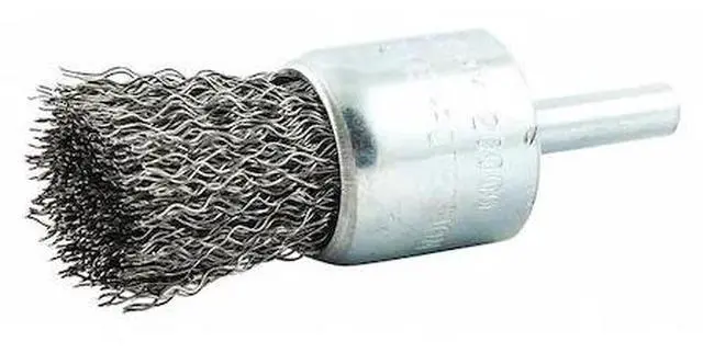 End Brush, Product Type End Brush, Quick Change System Not Applicable, Bristle Type Crimped Wire, Bristle Material Carbon Steel, Brush Dia. 1 in, Wire Dia. 0.014 in, Bristle Length 3/4 in, Grit Not Applicable, Overall Length 1 5/8 in, Compatible Tool Type Straight Grinder, Drill Press, Impact Driver, Pencil Grinder, Color Not Applicable, Primary Material Application Carbon Steel, Cast Iron, Wood, Connector Type Round Shank, Connector Size 1/4 in, Operating Speed - Maximum 20, 000 RPM.