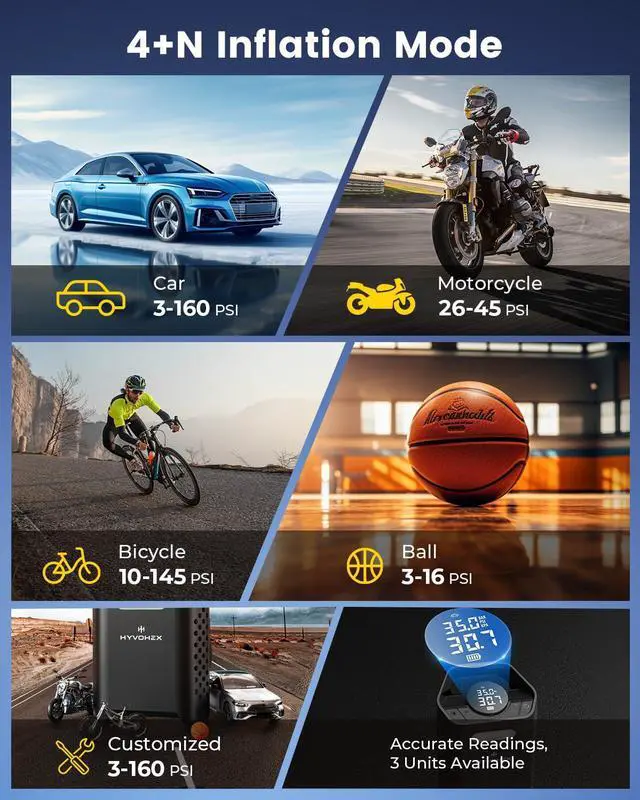 | Included Components | Air Compressor x 1, Air Chuck x 1, Pressure Hosex1, Presta Valve Adapter x 1, Ball Needle x 1, High-pressure Tapered Nozzle x 1, USB A to C Cable x 1, User Manual x 1 |