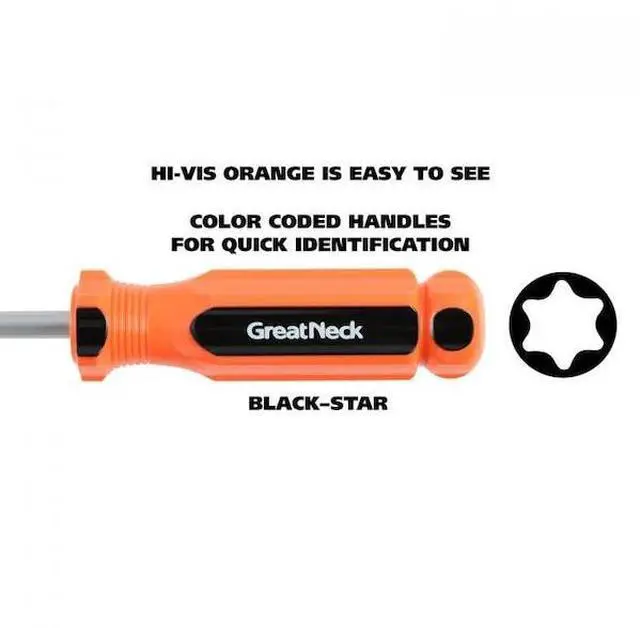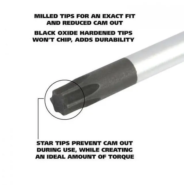 Star: T10 x 4", T15 x 4", T20 x 4", T25 x 5", T30 x 6". Fluted Handle Design Provides Multiple Gripping Points to Apply Torque from Various Angles. Tough Impact Resistant Acetate Handle to Stand Up to Everyday Use. Magnetized for a Secure Hold, Allowing One-Handed Use. Sand-blasted and Precision Machined Tip for an Exact Fit and Reduced Cam Out