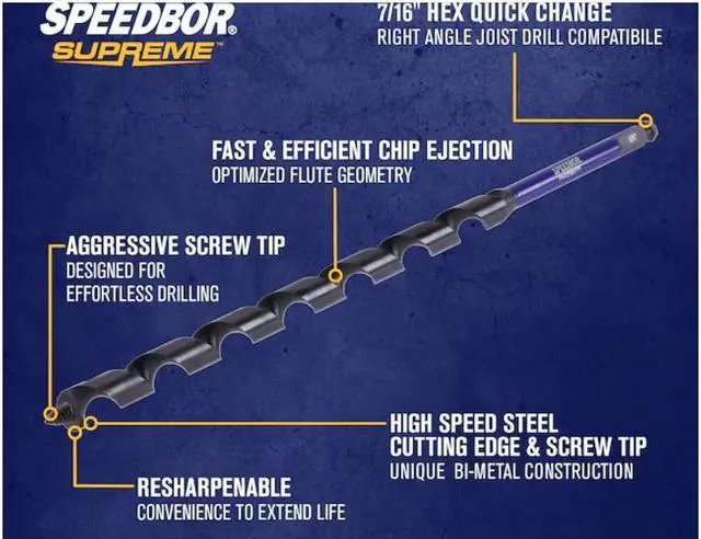 Charge through nail-embedded wood with the 3/4-in X 18-in SPEEDBOR SUPREME Auger Bit. Designed to deliver 3X longer life (On average compared to legacy IRWIN 3/4-in ship auger bit, SKU #47412) in challenging wood-drilling applications, this Auger Bit features a re-sharpenable blade and black oxide coating for enhanced corrosion resistance. Make quick, clean holes and avoid work interruptions with durable, bi-metal construction engineered to withstand repeated nail strikes. With the 3/4-in X 18-in SPEEDBOR SUPREME Auger Bit, youll REIGN SUPREME on the jobsite and be equipped to tackle any application with ease.