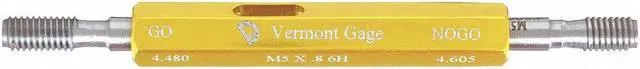 Threaded Plug Gauge Assembly, Dimension Type Metric, Gauge Type Go/No-Go (Plus/Minus), Handle Design Double End, Included Handle Taperlock 0, Thread Class 6H, Thread Size M5 x 0.80, Thread Type Metric, Tolerance Class X, Gauge Finish Chrome Plated, Gauge Length - Go Member 10.30 mm, Gauge Length - No-Go Member 7.10 mm, Gauge Material Tool Steel, Handle Color Yellow, Handle Length 2 in, Hardness RC 70-72, Included Certification Certificate of Accuracy with NIST Traceability. This item has been restricted from sale in the following state (s): []