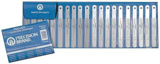 Feeler Gauge Set, Finish Uncoated, Blade Length 5 in, Blade Material High Carbon Spring Steel, Blade Style Straight Blade, Dimension Type Inch/Metric, Maximum Thickness - Inch 0.025 in, Maximum Thickness - mm 0.635 mm, Minimum Thickness - Inch 0.001 in, Minimum Thickness - mm 0.025 mm, Non-Marring No, Number of Feeler Blades 20, Thickness Range 0.001 in to 0.025 in. This item has been restricted from sale in the following state (s): []
