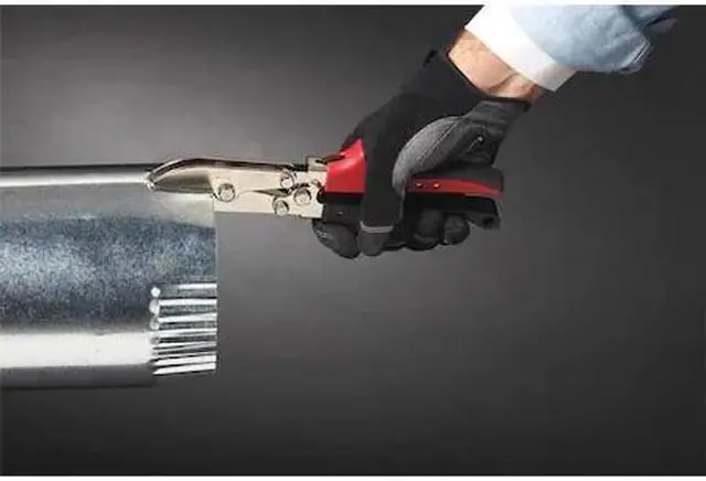 Sheet Metal Crimper, Jaw Depth 1 1/4 in, Max. Capacity - Sheet Metal Tool 22 ga Mild Steel, 24 ga Galvanized Steel, 26 ga Stainless Steel, Number of Blades 3, Depth Marking - Sheet Metal Tools No Markings, Overall Length - Sheet Metal Tool 9 in, Safety Latch Yes, Features Soft Touch, Non Slip Handle Insert, Unique One-Hand Operation Latch, Ergonomically Contoured Handles, Opening Maximizes Handle Leverage. This item has been restricted from sale in the following state (s): []
