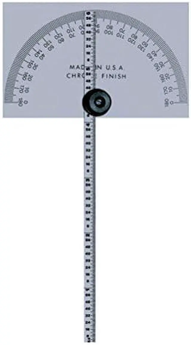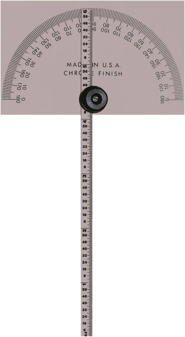 This Mitutoyo 968-203 Protractor is the perfect tool for measuring angles. It has a length of 6 in., with graduations at 1/64 in. The steel protractor has a rectangular head and features satin chrome finish, making it durable and easy to clean. Its blade is graduated into degrees with an angle range of 0 to 180 degrees. With graduations at 1 degree, this manual reading protractor has a size of 6 in. long by 6 in. wide. You will want to keep this MITUTOYO Protractor on hand for all your measuring needs.