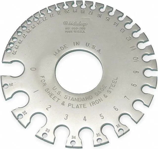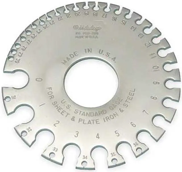 Sheet Metal Thickness Gauge, Dimension Type Inch/US Sheet Metal, Gauge Standard US Sheet Metal, Maximum Measurement - Inch 0.312 in, Maximum Measurement - Gauge #0, Minimum Measurement - Inch 0.007 in, Minimum Measurement - Gauge #36, Thickness 0.105 in, Material Steel, Outside Diameter 3 5/16 in, Range - Inch 0.007 in to 0.312 in, Range - Gauge #36 to #0. This item has been restricted from sale in the following state (s): []