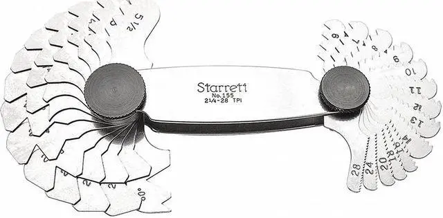 Thread Pitch Gauge Set, Included Threads per Inch 2 1/4 TPI, 2 3/8 TPI, 2 1/2 TPI, 2 5/8 TPI, 2 3/4 TPI, 2 7/8 TPI, 3 TPI, 3 1/4 TPI, 3 1/2 TPI, 4 TPI, 4 1/2 TPI, 5 TPI, 5 1/2 TPI, 6 TPI, 7 TPI, 8 TPI, 9 TPI, 10 TPI, 11 TPI, 12 TPI, 13 TPI, 14 TPI, 16 TPI, 18 TPI, 20 TPI, 24 TPI, 28 TPI, Maximum Thread Pitch - mm 28, Maximum TPI 28, Minimum Thread Pitch - mm 2 1/4, Minimum TPI 2 1/4, Number of Leaves 27, Thread Angle 60 Degrees, Thread Type Metric, Gauge Material Steel, Locking Device Yes.