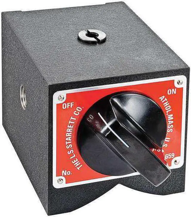 The Starrett 659P Magnetic Indicator Holder is a heavy-duty tool for holding magnetic test indicators. It has a strong, sturdy base and works well with various types of equipment. The 3/8-24 thread size on the indicator holder allows it to be mounted on various machines. The cast iron construction makes this magnetic base very durable and sturdy. This base only holds up to 150 lbf. It measures 2 1/2 in. wide x 3 in. deep x 2 1/8 in. high overall, making it easy to transport from one workstation to another as needed.