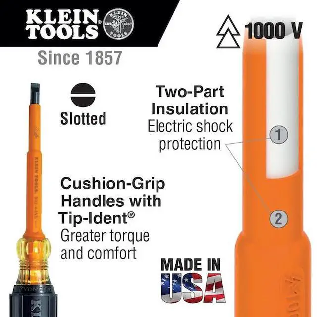 California Proposition 65: This product contains a chemical known to the State of California to cause birth defects or other reproductive harm. Insulated Slotted Screwdriver, Tip Size 1/4 in, Slotted, Cushion, Overall Length 11 1/4 in, ESD Safe No, Non-Sparking No, Non-Magnetic No, Insulated Yes, Corrosion Resistant Yes, No, Tip Finish Black Oxide, Shank Coating Insulated. This item has been restricted from sale in the following state (s): []