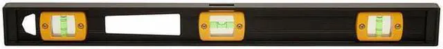 I-Beam Level, Frame Material Aluminum, Length 24 in, Nonmagnetic, Top Read Yes, Total Number of Vials 3, Number of Plumb Vials 2, Number of Level Vials 1, Number of 30 Degree Vials 0, Number of 45 Degree Vials 0, Lighted Vials No, Number of V-Grooves 0, Vial Type Glo-View (R), Vial Material Acrylic, Number of Magnets 1, Magnet Type Rare Earth, Color Black, Features Replaceable Vials, Includes Protective Shock-Absorbing Plastic End Caps. This item has been restricted from sale in the following state (s): []