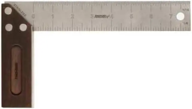 Try Square, Base Length 4 3/16 in, Base Width 1 1/2 in, Blade Length 8 in, Blade Width 9 1/2 in, Blade Material Stainless Steel, Graduation Mark Style Etched, Graduation Marks - Base 1/16 in, Graduation Marks - Blade 1/16 in, Specialized Scales Not Applicable, Base Material Bamboo, System of Measurement SAE, Square Type Try Square, Coating Clear, Edge Style Square, Features Corrosion Resistant, Finish Polished, Graduation Color Black, Straightness Tolerance +/- 0.005 in, Thickness 0.69 in. This item has been restricted from sale in the following state (s): []