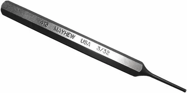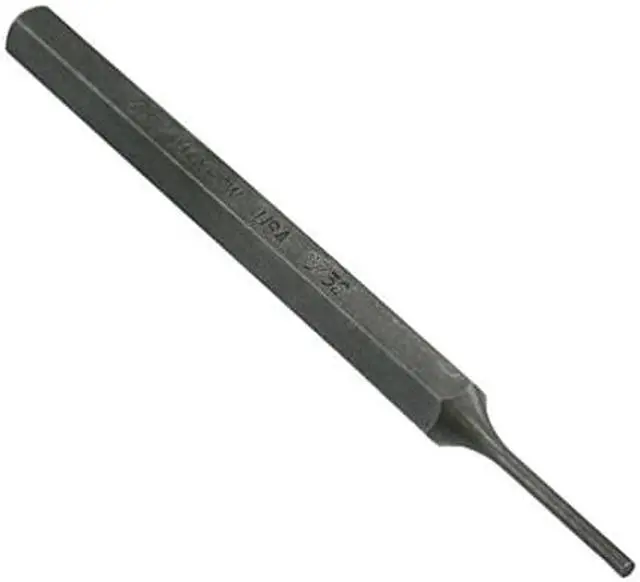 Pin Punch, Automatic No, Punch Type Pin Punch, Tip Size 3/32 in, Tip Type Flat, Shank Shape Hexagon, Shank Width 5/16 in, Grip Style Plain, Hole Diameter 3/32 in, Overall Length 4 1/2 in, Container Type Bulk, Material Applications Metal, Includes Striking Cap No, Measurement Type SAE, Includes Handguard No, Taper Length 7/8 in, Tether Ready No, Includes Handle No, Corrosion-Resistant Yes, Features Pin Punches are Used to Drive Out and Remove Loosened Pins and Key, Finish Black Oxide.