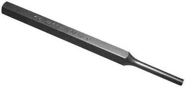 Pin Punch, Automatic No, Punch Type Pin Punch, Tip Size 3/16 in, Tip Type Flat, Shank Shape Hexagon, Shank Width 3/8 in, Grip Style Plain, Hole Diameter 3/16 in, Overall Length 5 1/4 in, Container Type Bulk, Material Applications Metal, Includes Striking Cap No, Measurement Type SAE, Includes Handguard No, Taper Length 1 1/4 in, Tether Ready No, Includes Handle No, Corrosion-Resistant Yes, Features Pin Punches are Used to Drive Out and Remove Loosened Pins and Key, Finish Black Oxide.