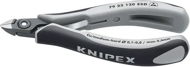 Pliers, Precision Diagonal Cutting Pliers, Precision Diagonal Cutting Plier, Flush Cut, ESD Safe Yes, Jaw Width 23/64 in, Jaw Length 1/4 in, Material Chrome Vanadium Steel, Overall Length 4 3/4 in, Voltage Rating Not Rated, Nonsparking No, Tether Capable, Insulated No, Nose Type Oval, Cutting Capacity/Material 1/64 in Med Hard, 1/64 to 1/32 in Soft, Spring Return Yes, Wire Stripper No, Jaw Bend 0 Degrees, Tip Width 1/4 in, Handle Type Ergonomic, Handle Color Black/Gray. This item has been restricted from sale in the following state (s): []