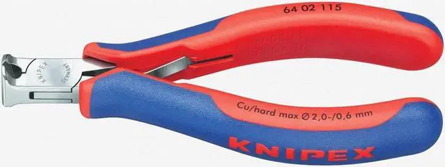 precision pliers for ultra fine cutting work, e.g. in electronics and fine mechanics Sturdy, zero backlash box joint Low-friction double spring for gentle and even opening The polish together with a fine film of oil offer effective rust protection - no circuit faults caused by peeling chrome from plated tools Cutting edges additionally induction hardened ; hardness at least 56 HRC High-grade special tool steel, forged, oil-hardened End Cutter, with bevel, handles with multi-component grips, cutting capacity: 2.0 mm Article No. mmStyleHeadHandlesCutting Capacites (Ø mm)Dimensions (mm) gABDC64 01 1151150polishedplastic coated2.01.00.611.06.07.516.07664 02 1151150mirror polishedwith multi-component grips2.01.00.611.06.07.516.09464 11 1151151polishedplastic coated1.40.811.06.07.016.07464 12 1151151mirror polishedwith multi-component grips2.00.80.511.06.07.016.09164 22 1151152mirror polishedwith multi-component grips0.810.020.06.03.06564 32 1151203mirror polishedwith multi-component grips1.51.00.511.010.07.017.09264 42 1151154mirror polishedwith multi-component grips1.51.00.510.510.07.012.06964 52 1151155mirror polishedwith multi-component grips1.310.510.07.012.06964 62 1201206mirror polishedwith multi-component grips0.69.518.56.05.07064 72 1201207mirror polishedwith multi-component grips1.512.019.57.05.09564 12 115 ESD1151mirror polishedwith multi-component grips2.00.80.511.06.07.016.09464 32 115 ESD1203mirror polishedwith multi-component grips1.51.00.511.010.07.017.09264 62 120 ESD1206mirror polishedwith multi-component grips0.69.518.56.05.070