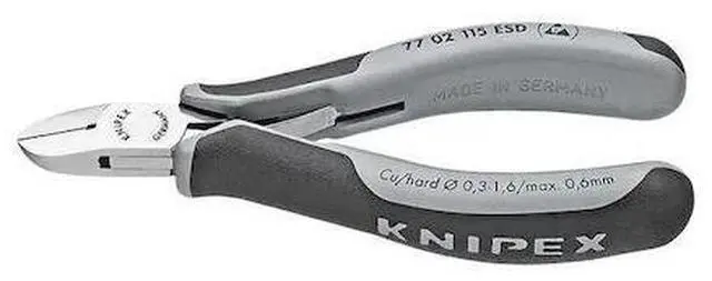 Electrostatic energy is discharged through the handles in a gradual and controlled manner Which protects components endangered by electrostatic discharge In accordance with applicable standards, e.g. IEC TR 61 340-5, DIN EN 61 340-5, SP Method 2472 For fine cutting work, e.g. in electronics and fine mechanics Electrically discharging handles - dissipative Sturdy, zero-backlash box joint Low-friction double spring for gentle and even opening The mirror polish together with a fine film of oil offer effective rust protection - no circuit faults caused by peeling chrome from plated tools Cutting edges additionally induction hardened, cutting edge hardness approx. 62 HRC With two-color dual component grips, black/grey High-grade special tool steel, forged, oil-hardened Round head, with small bevel Mirror polished head Article No. mmHeadHandlesCutting Capacites (mm)Dimensions (mm) gBAD77 02 115 ESD115round, mirror polishedwith multi-component grips1.61.20.614.011.07.58277 02 120 H ESD120round, mirror polishedwith multi-component grips2.01.41.00.614.011.07.58577 02 135 H ESD135round, mirror polishedwith multi-component grips2.21.61.20.818.015.09.511677 12 115 ESD115round, mirror polishedwith multi-component grips1.61.20.614.011.07.58077 22 115 ESD115round, mirror polishedwith multi-component grips1.31.014.011.07.08077 32 115 ESD115pointed, mirror polishedwith multi-component grips1.31.00.514.011.07.57977 32 120 H ESD120pointed with chamfer, mirror polishedwith multi-component grips1.61.00.60.214.011.07.07977 42 115 ESD115pointed, mirror polishedwith multi-component grips0.3 - 1.30.814.011.07.57877 52 115 ESD115pointed, mirror polishedwith multi-component grips0.3 - 1.00.80.514.011.07.579