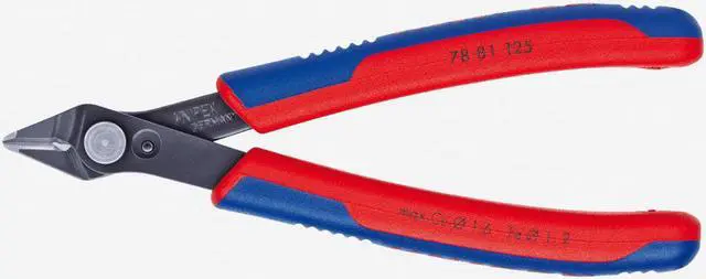 Electronic Super KnipsPrecision pliers for ultra fine cutting work, e.g. in electronics and fine mechanics Ground, very sharp cutting edges without bevel for flush cutting Precision shaped tips cut through close wires from 1/64" diameter Stainless steel rivet Cutting edges additionally induction hardened Extremely smooth movement for minimum operator fatigue With opening spring INOX or Special tool steel Article No. mmPliersHeadHandlesCutting Capacites (mm)Dimensions (mm) gBAD78 03 125125polishedwith multi-component grips0.2 - 1.61.09.013.57.55678 03 140140polishedwith multi-component grips 0.2 - 2.1 1.2 12.3 15.79.27778 13 125125polishedwith multi-component grips0.2 - 1.61.09.013.57.55778 23 125125polishedwith multi-component grips0.2 - 1.00.65.513.57.55578 31 125125burnishedwith multi-component grips0.2 - 1.09.012.57.55578 41 125125burnishedwith multi-component grips0.2 - 1.09.012.57.55778 61 125125burnishedwith multi-component grips0.2 - 1.61.29.013.57.55678 61 140140burnishedwith multi-component grips0.2 - 2.11.412.315.79.27778 71 125125burnishedwith multi-component grips0.2 - 1.61.29.013.57.55778 81 125125burnishedwith multi-component grips0.2 - 1.61.20.69.013.57.55778 91 125125burnishedwith multi-component grips0.2 - 1.61.20.69.013.57.557