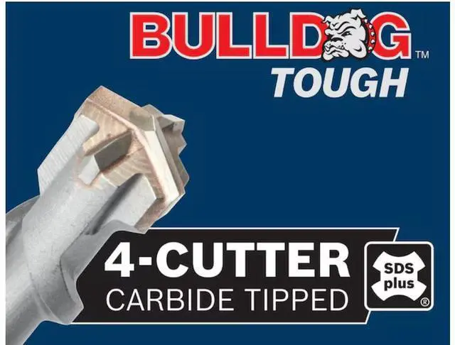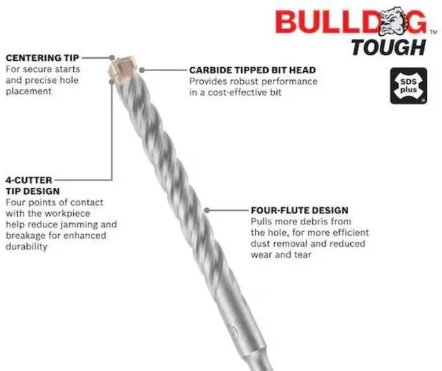 The Bosch Bulldog Tough Rotary Hammer Bit features a four-cutter head, for an SDS-plus® with fast drilling and enhanced durability in concrete with rebar. This bit delivers 2X life vs. standard SDS-plus® bits. These bits feature a four-cutter design, helping to prevent the bit from getting stuck in rebar, one cutting edge that hits the rebar no matter the angle, so it doesnt get stuck and break. The four-flute design aggressively pulls dust away from the work, for fast drilling and longer bit life. This bit provides accurate centering, making it ideal for anchoring.