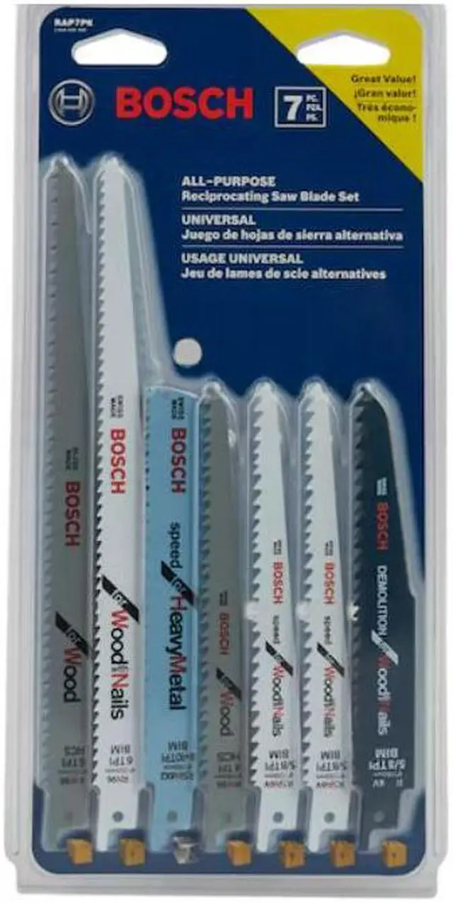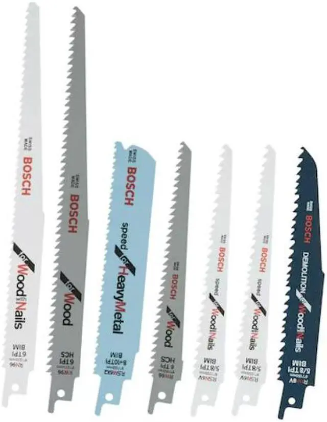 The Bosch All-Purpose Reciprocating Saw Blade Set features blades made with bi-metal and high carbon steel construction, delivering maximum life and durability in heavy use. These blades feature teeth that are optimized for cutting efficiency. The kit features a variety of blades designed for key professional applications. The blades will tackle wood, wood with nails, metal, plastic and PVC. These recip blades feature precision-ground teeth designed for fast cutting, high performance and staying sharp longer. By incorporating high-quality materials, best manufacturing processes and proven tooth-design features, Bosch provides professional reciprocating saw blades that cut faster and last longer.