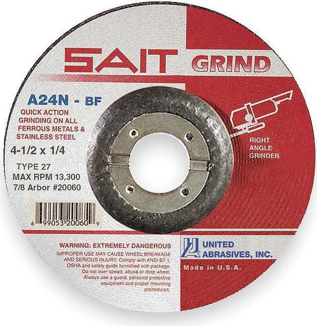 Depressed Center Wheels, Abrasive Wheel Type Type 27, Abrasive Wheel Diameter 4 1/2 in, Thickness 0.25 in, Arbor Hole Size 7/8 in, Abrasive Material Aluminum Oxide, Abrasive Grit 24, Max. RPM 13, 300 RPM, Series A24N, Grade Very Coarse, Application Ferrous Metal, Stainless. This item has been restricted from sale in the following state (s): []